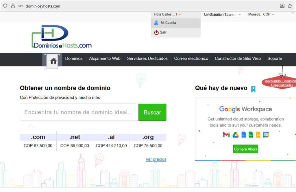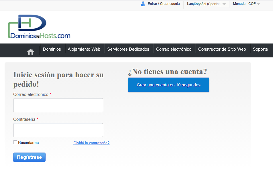 Como acceder a tu panel de control de Dominios y Hosts (dominiosyhosts.com) y damos click en Entrar / Crear cuenta: