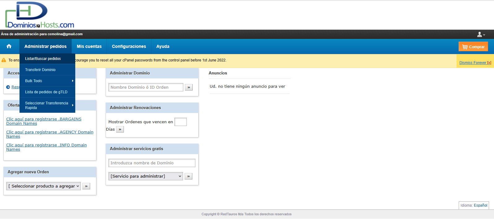 Es importante destacar que en cPanel Details, podemos cambiar el password de nuestro cPanel. Ademas de encontrar la dirección o url para acceder al cPanel.